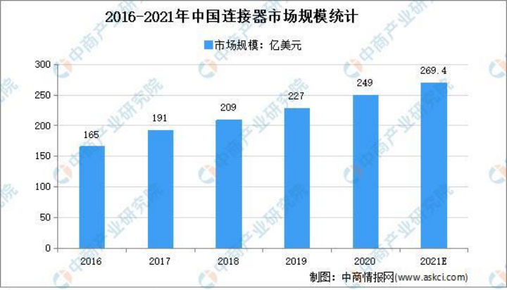 In recent years, China’s economy has maintained sustained and rapid growth. Driven by the rapid development of China’s economy, communications, transportation, computers, consumer electronics and other connector downstream markets have also achieved rapid growth, directly driving the sharp growth of China’s connector market demand. Data shows that from 2016 to 2019, China’s connector market grew from 16.5 billion DOLLARS to 22.7 billion dollars. China Business Industry Research Institute predicts that in 2021, the size of China’s connector market will reach us $26.94 billion.